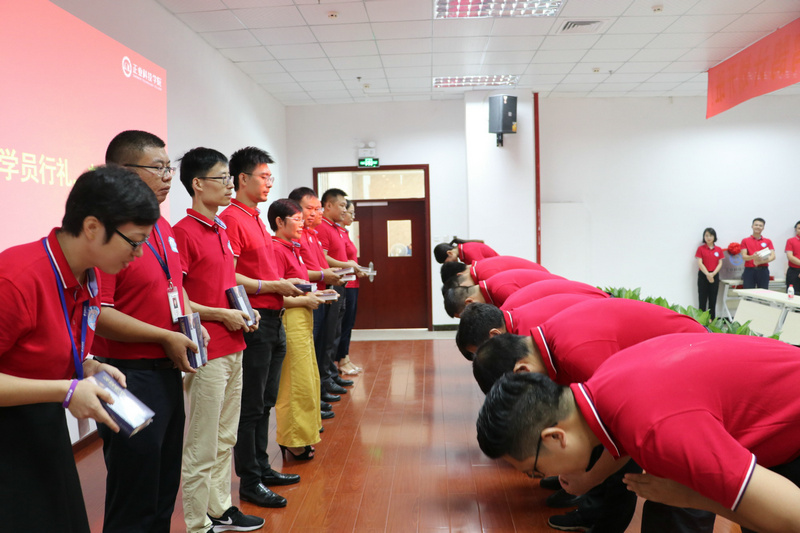 開班儀式上舉行了莊嚴(yán)的拜師儀式,42位儲備高管分別給老師們行拱手禮,感謝老師們的悉心栽培,從此發(fā)奮圖強(qiáng),為公司的事業(yè)再創(chuàng)輝煌,老師們贈書給學(xué)員作為回贈。